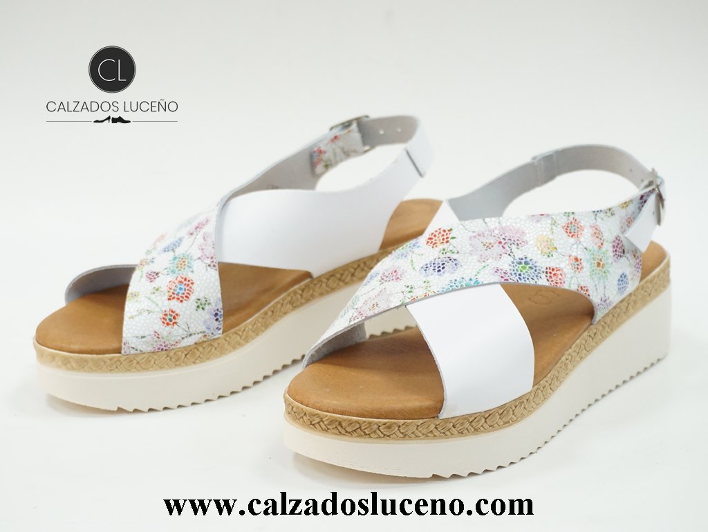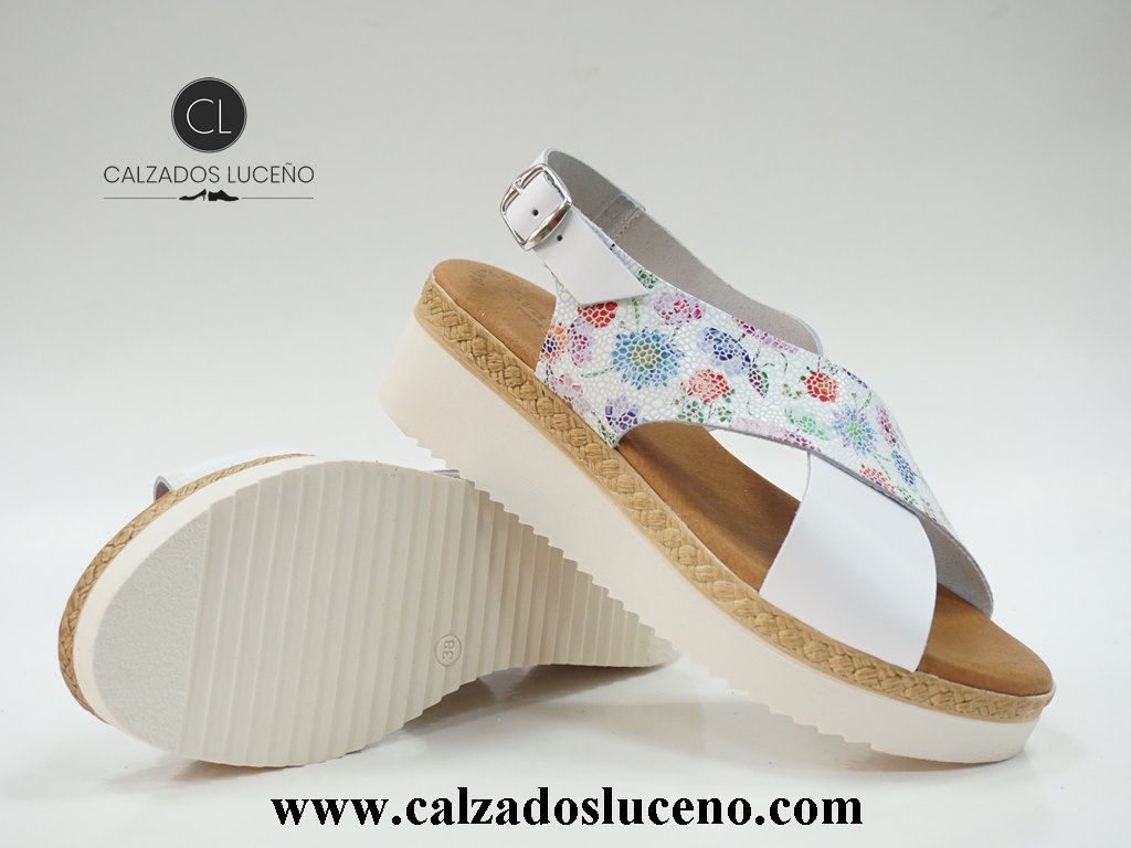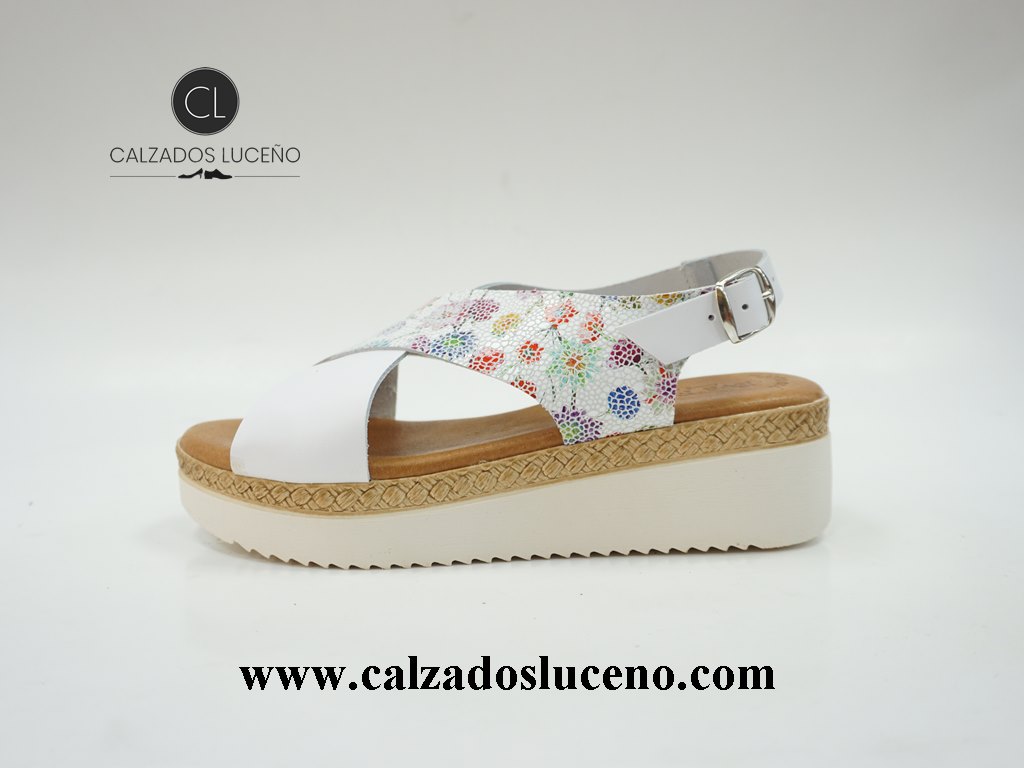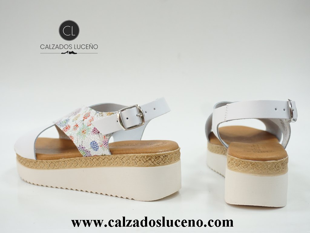 Eva Frutos Sandalia Mujer Plataforma Dalí Blanca Multicolor Modelo 3338 Con Plantilla de Gel Forrada de Piel Empeine Fabricado en Cuero Con Tora en el Talon, La Suela es Antideslizante Fabricadas en España.